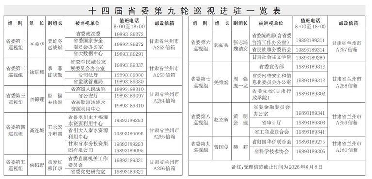 據(jù)悉,省委各巡視組將在被巡視部門單位工作2個半月左右,巡視期間設立專門值班電話和郵政信箱,主要受理反映被巡視黨組織領導班子及其成員、下一級黨組織主要負責人和重點崗位人員問題的來信來電來訪,重點是關于違反政治紀律、組織紀律、廉潔紀律、群眾紀律、工作紀律、生活紀律等方面的舉報和反映。巡視組受理信訪時間截止到2026年6月9日。(記者金鑫)